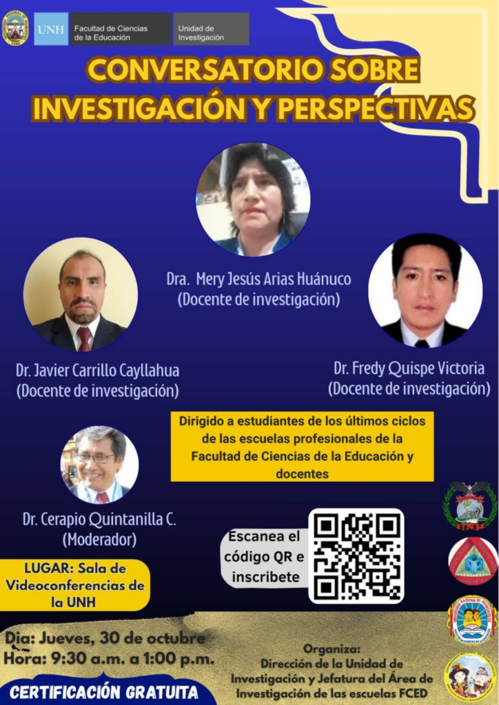 ➡️ CONVERSATORIO SOBRE INVESTIGACIÓN Y PERSPECTIVAS Por facebook 24 Oct 2025 Dirigido a estudiantes de los últimos ciclos de las escuelas profesionales de la Facultad de Ciencias de la Educación de la UNH.